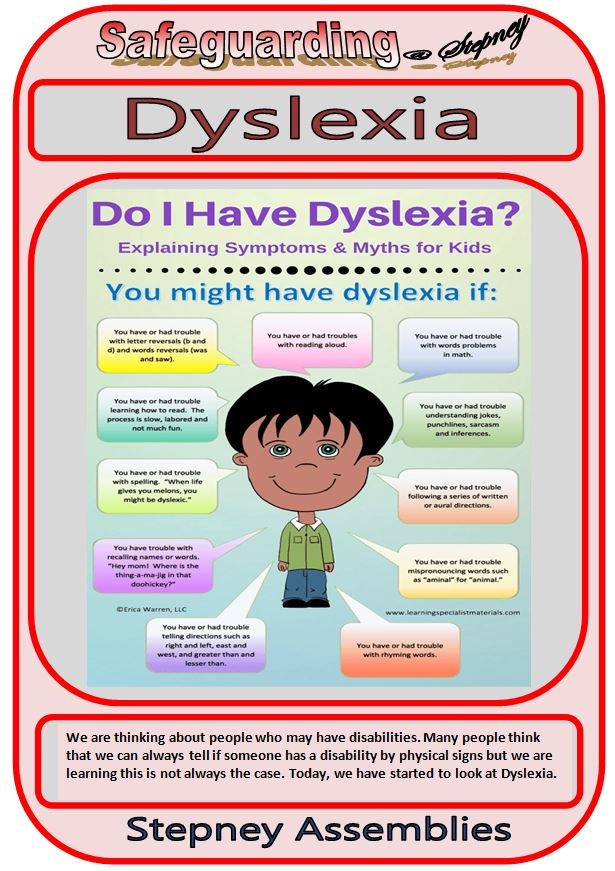 In our next series of safeguarding assemblies we are going to be talking about people who have specific learning needs that we may now know about. The first is on Dyslexia. Miss Atkinson has been discussing how children with dyslexia may need support from others and consideration when doing their work. Being such a close-knit community, as we are at Stepney, means caring for everyone.