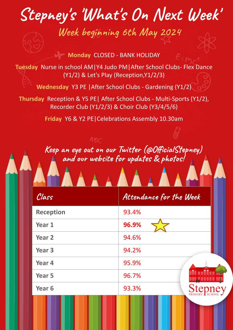 'Stepney's What's On Next Week'bibbyl6May 3, 20241 min readPlease see below events and activities happening in school for the week beginning 6th May 2024